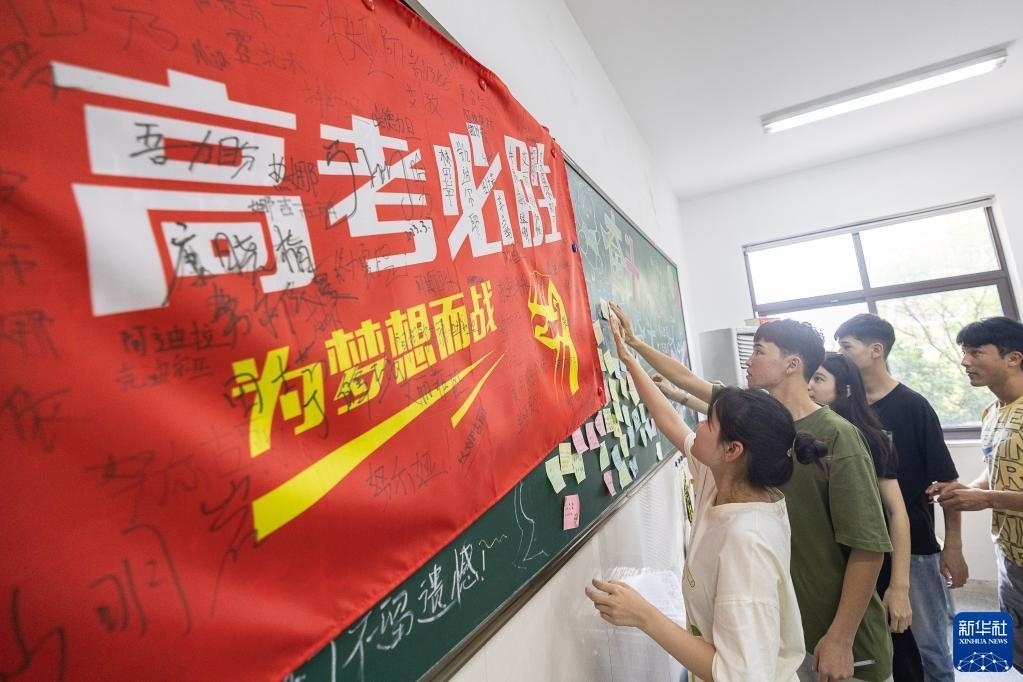 5月28日,在浙江省湖州市長(zhǎng)興縣職業(yè)技術(shù)教育中心學(xué)校,高三學(xué)生在黑板上粘貼高考寄語(yǔ)。