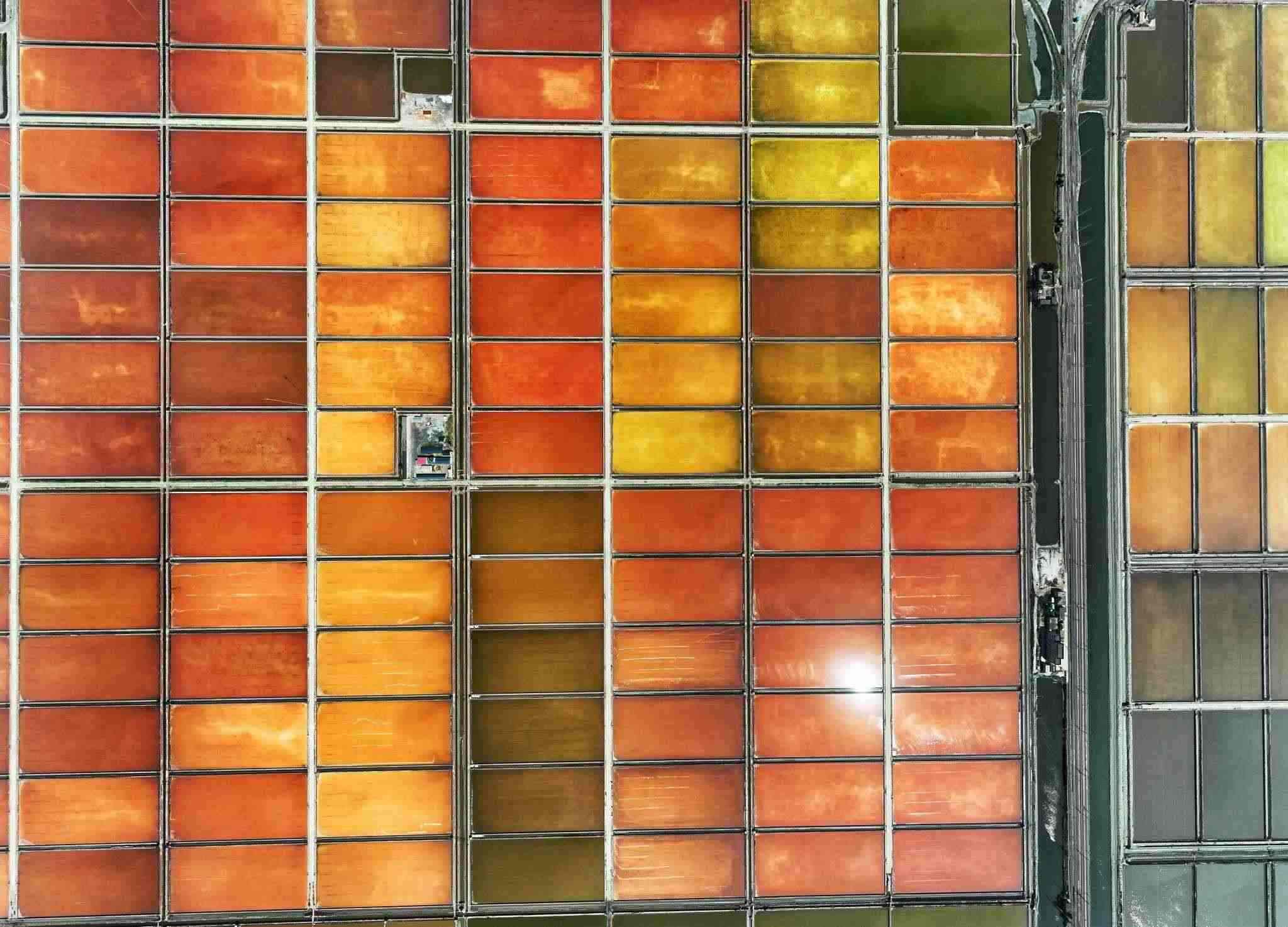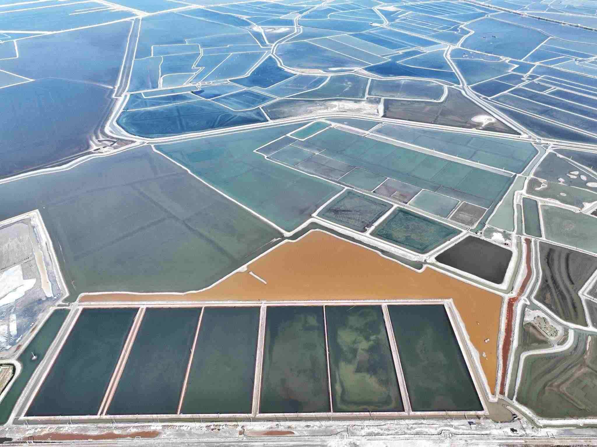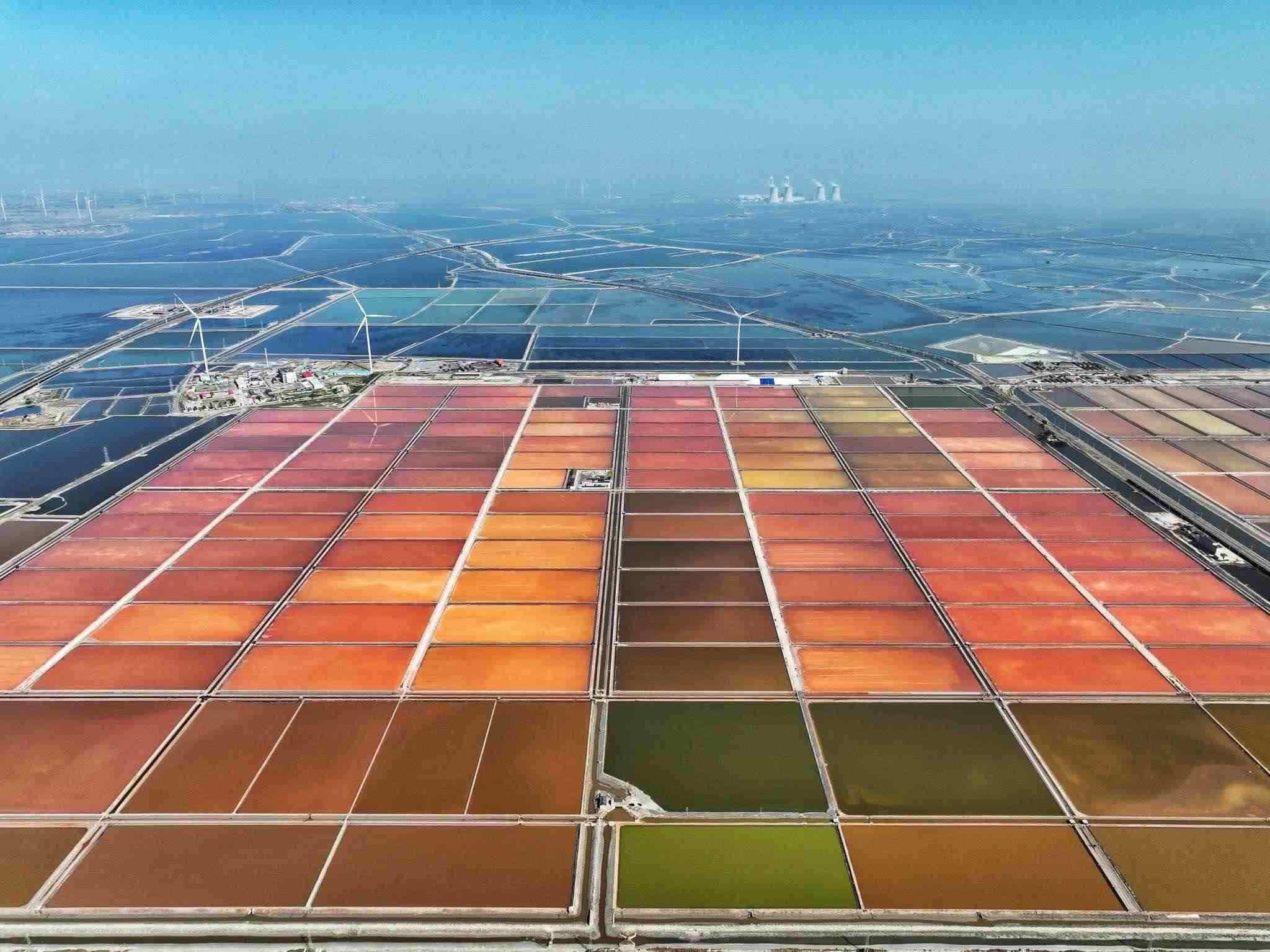 2023年5月22日,天津,位于渤海之濱的長蘆漢沽鹽場(chǎng)色塊分明,俯瞰如大地調(diào)色盤。視覺中國