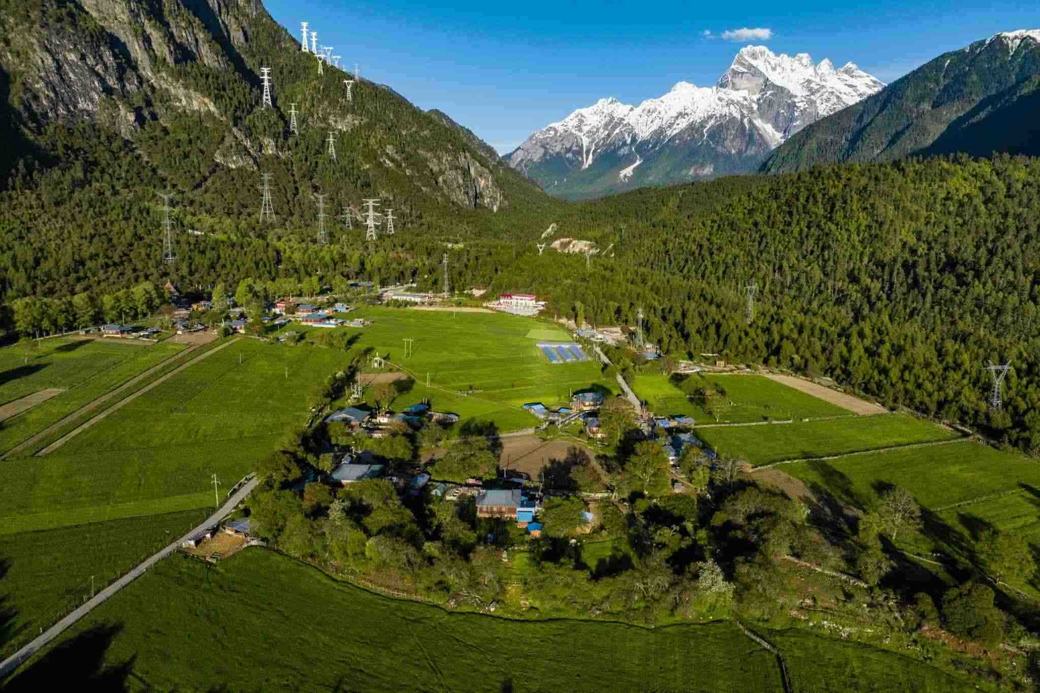 西藏林芝:村莊樹木茂密 遠處雪山巍峨