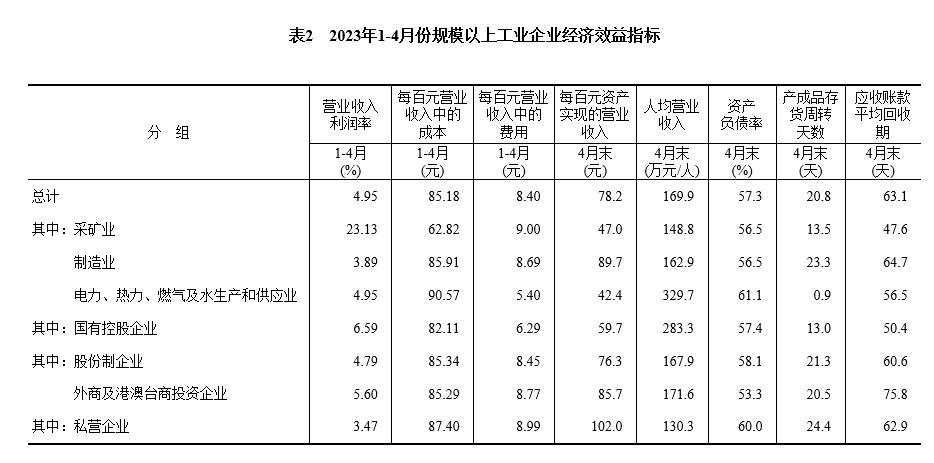1—4月份,規(guī)模以上工業(yè)企業(yè)實(shí)現(xiàn)營(yíng)業(yè)收入41.07萬億元,同比增長(zhǎng)0.5%;發(fā)生營(yíng)業(yè)成本34.98萬億元,增長(zhǎng)1.6%;營(yíng)業(yè)收入利潤(rùn)率為4.95%,同比下降1.32個(gè)百分點(diǎn)。