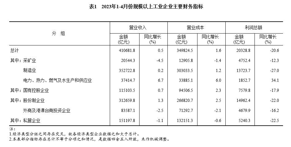 1—4月份,規(guī)模以上工業(yè)企業(yè)中,國有控股企業(yè)實(shí)現(xiàn)利潤(rùn)總額7579.8億元,同比下降17.9%;股份制企業(yè)實(shí)現(xiàn)利潤(rùn)總額14962.4億元,下降22.0%;外商及港澳臺(tái)商投資企業(yè)實(shí)現(xiàn)利潤(rùn)總額4679.9億元,下降16.2%;私營(yíng)企業(yè)實(shí)現(xiàn)利潤(rùn)總額5240.3億元,下降22.5%。