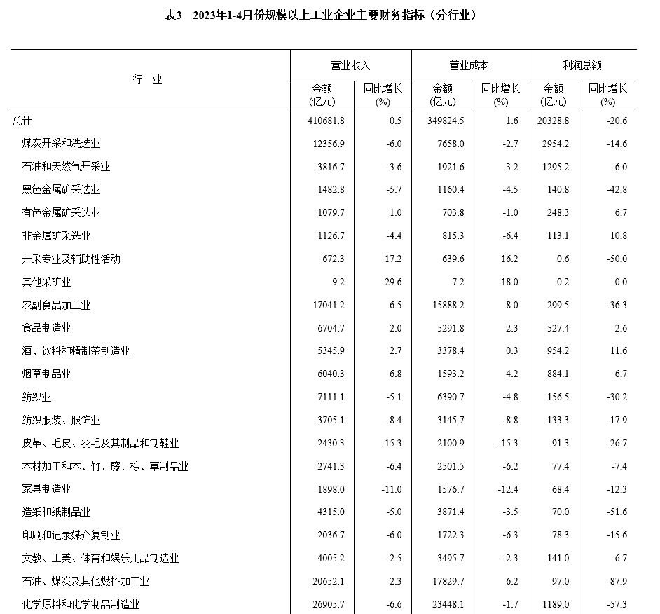 央視網(wǎng)消息:據(jù)國家統(tǒng)計(jì)局網(wǎng)站消息,1—4月份,全國規(guī)模以上工業(yè)企業(yè)實(shí)現(xiàn)利潤(rùn)總額20328.8億元,同比下降20.6%(按可比口徑計(jì)算,詳見附注二)。