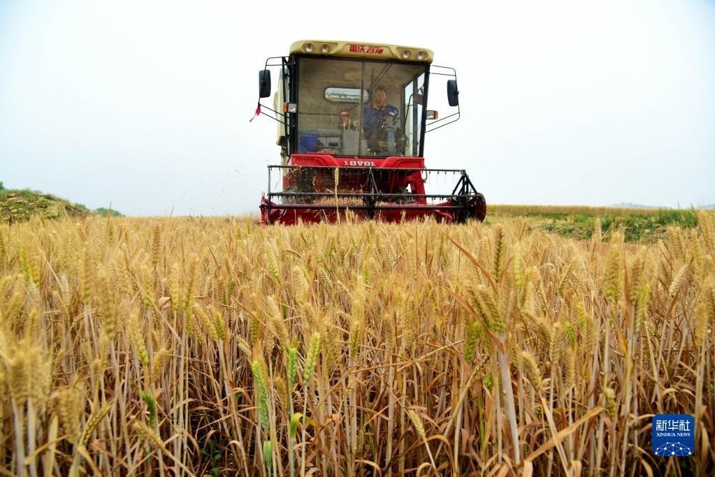 5月27日,在山東省棗莊市光明路街道田莊村麥田里,農(nóng)民駕駛農(nóng)機收獲小麥。