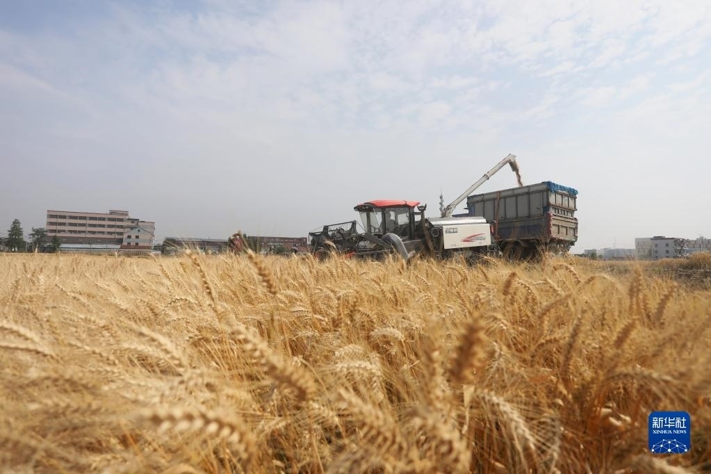 在浙江省嘉興市南湖區(qū)余新鎮(zhèn)金星村一片麥田里,農(nóng)民駕駛農(nóng)機收割小麥(5月26日攝)。