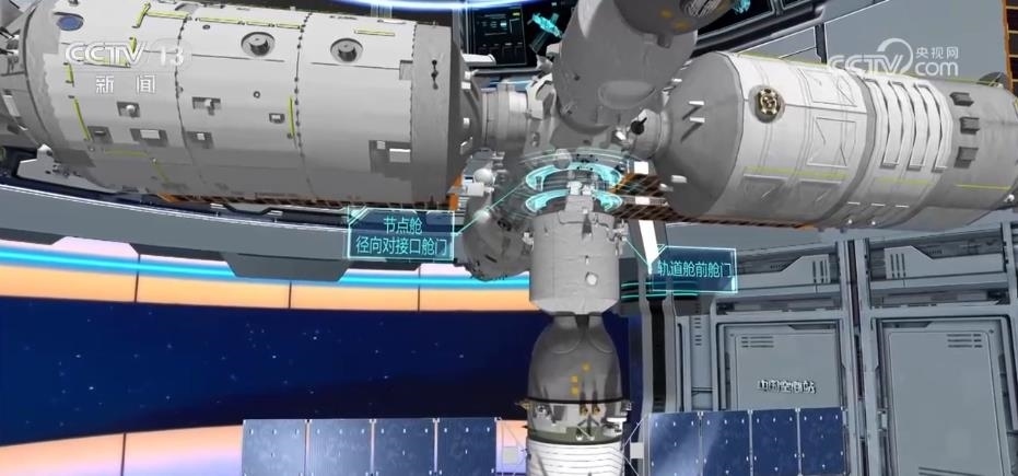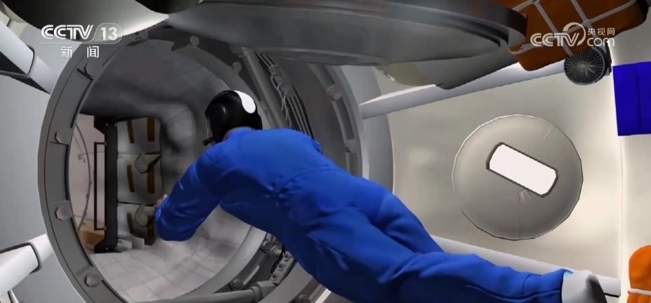 我們通過虛擬演示從“外邊”了解了航天員如何從飛船進入空間站。再通過動畫和上次兩個乘組會師的畫面,從“里邊”看一下這個過程。