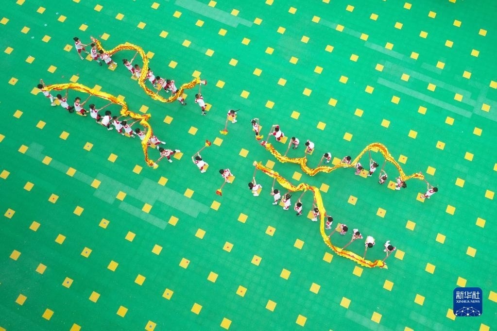 5月30日,在河北省唐山市豐潤(rùn)區(qū)左家塢鎮(zhèn)中心幼兒園,孩子們?cè)诒硌菸椠埞?jié)目(無人機(jī)照片)。 新華社發(fā)(朱大勇攝)