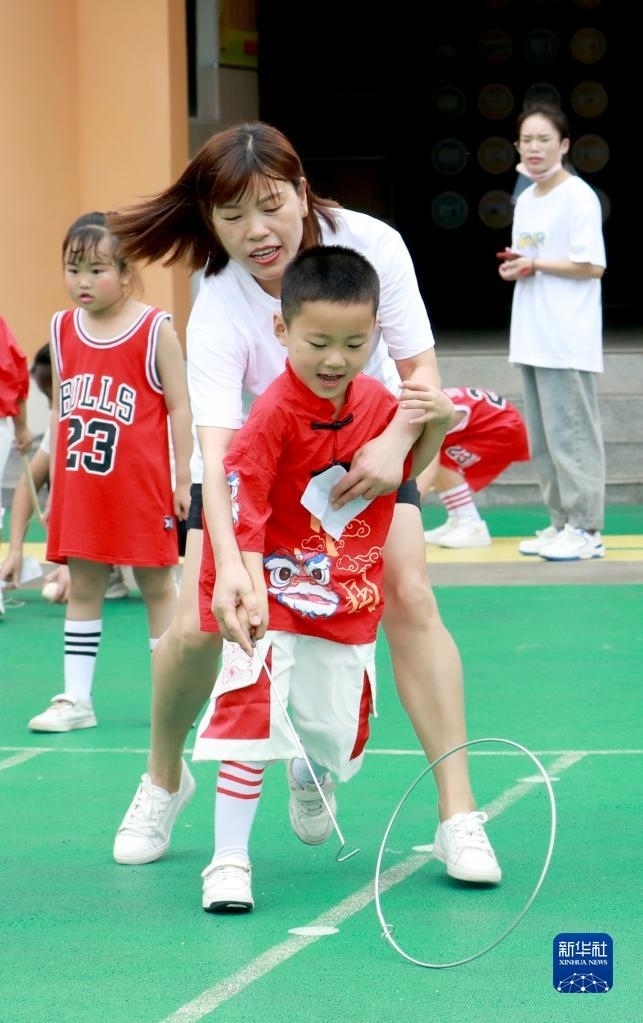 5月30日,在四川省華鎣市杜家坪幼兒園,家長(zhǎng)和孩子在一起參加滾鐵環(huán)游戲。 新華社發(fā)(周松林?jǐn)z)