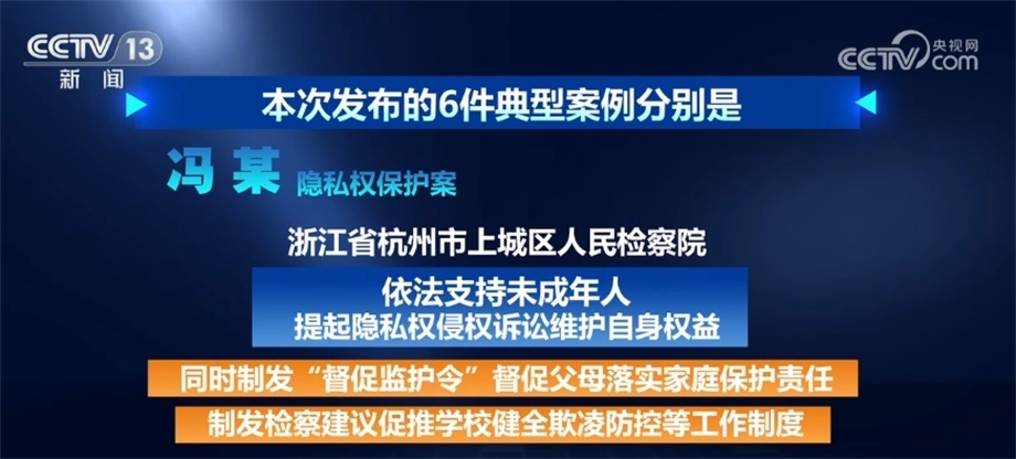 馮某隱私權(quán)保護(hù)案。針對未成年人隱私視頻被轉(zhuǎn)發(fā),生活學(xué)習(xí)受到影響,浙江省杭州市上城區(qū)人民檢察院依法支持未成年人提起隱私權(quán)侵權(quán)訴訟維護(hù)自身權(quán)益。同時,制發(fā)“督促監(jiān)護(hù)令”督促父母落實(shí)家庭保護(hù)責(zé)任,制發(fā)檢察建議促推學(xué)校健全欺凌防控等工作制度。