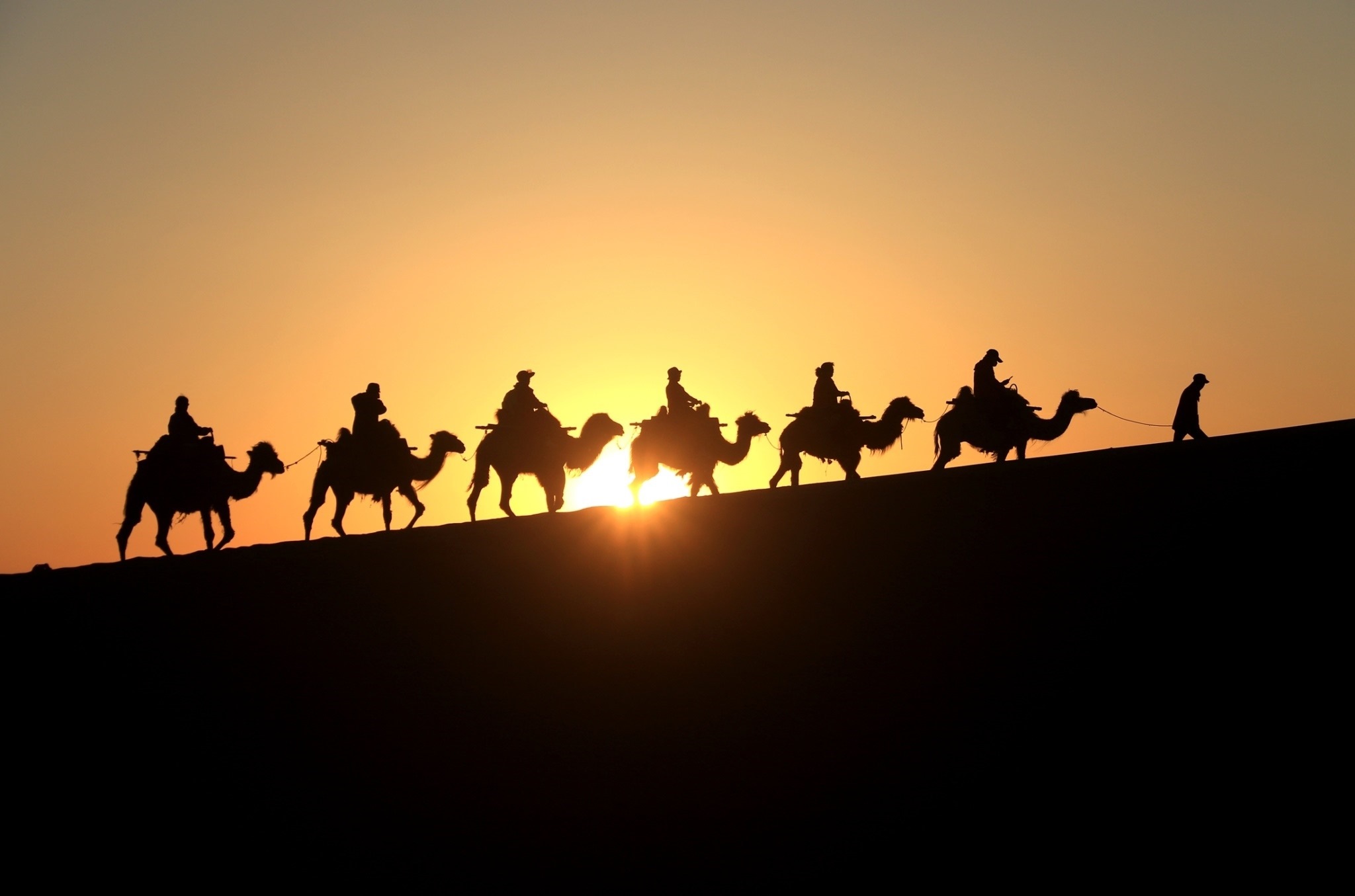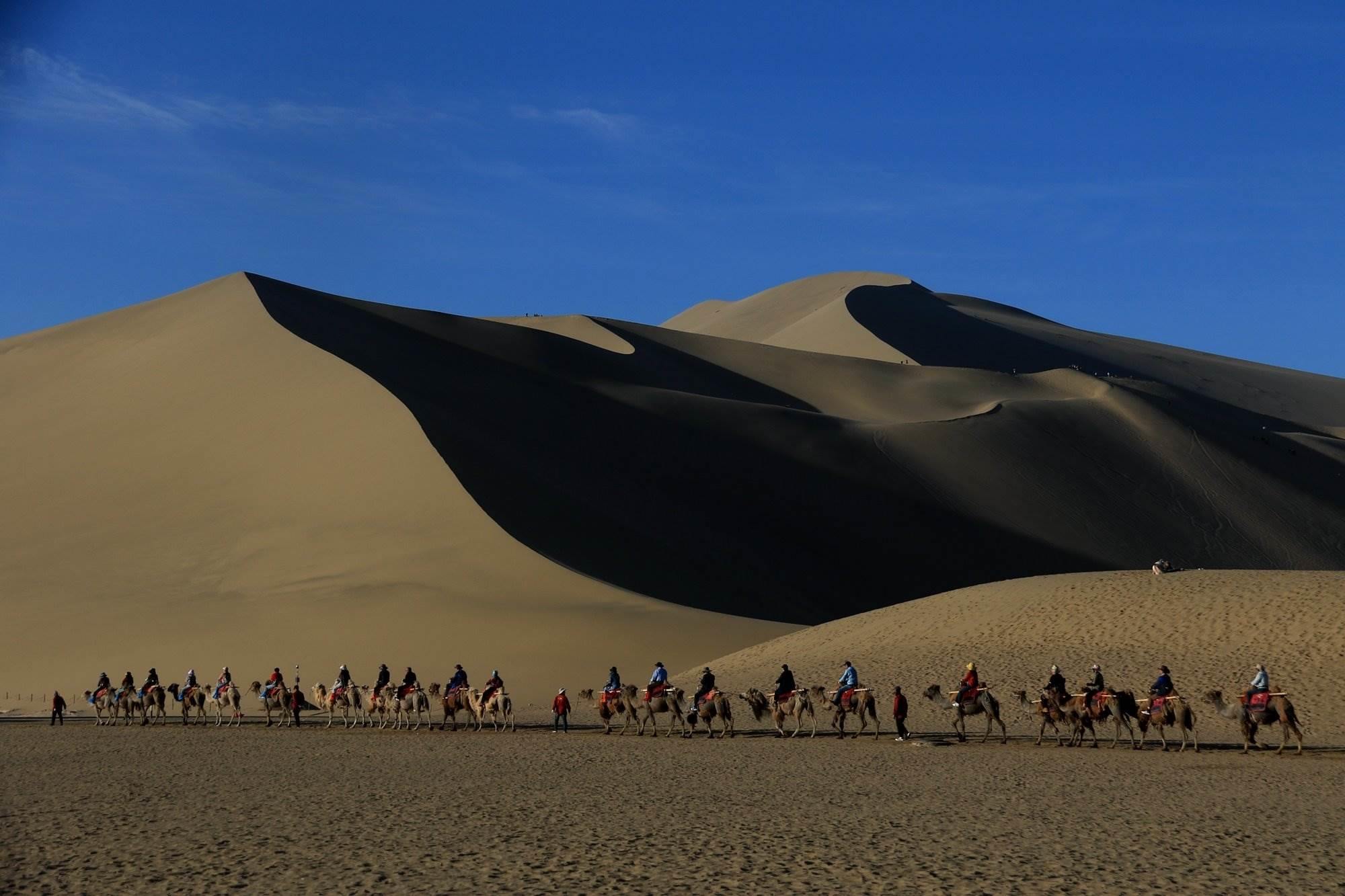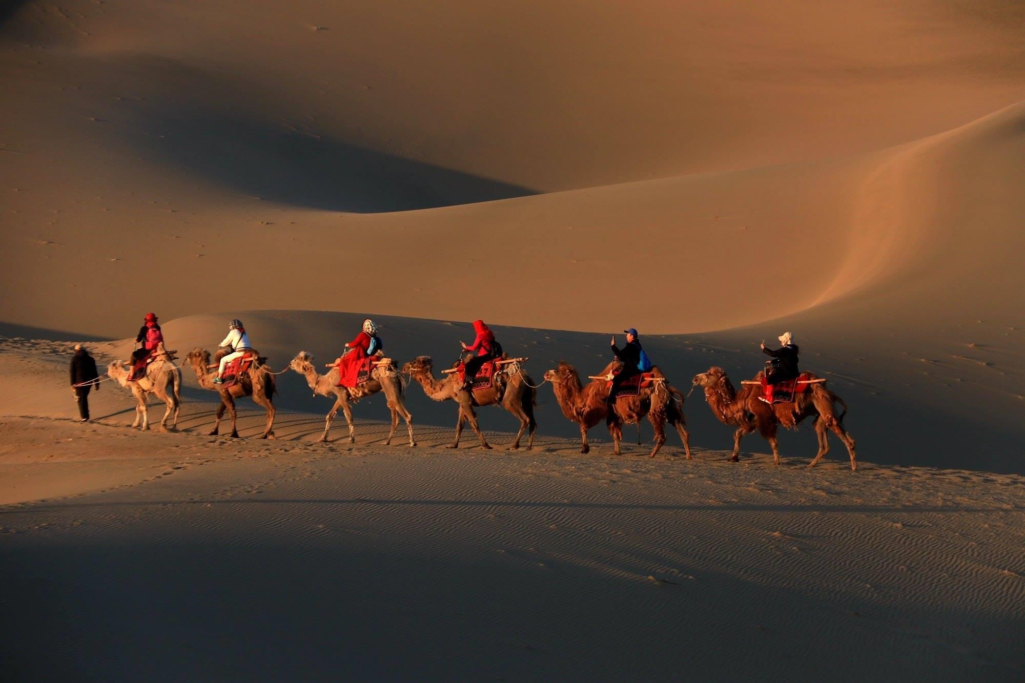 甘肅敦煌:游客騎駱駝游覽鳴沙山
