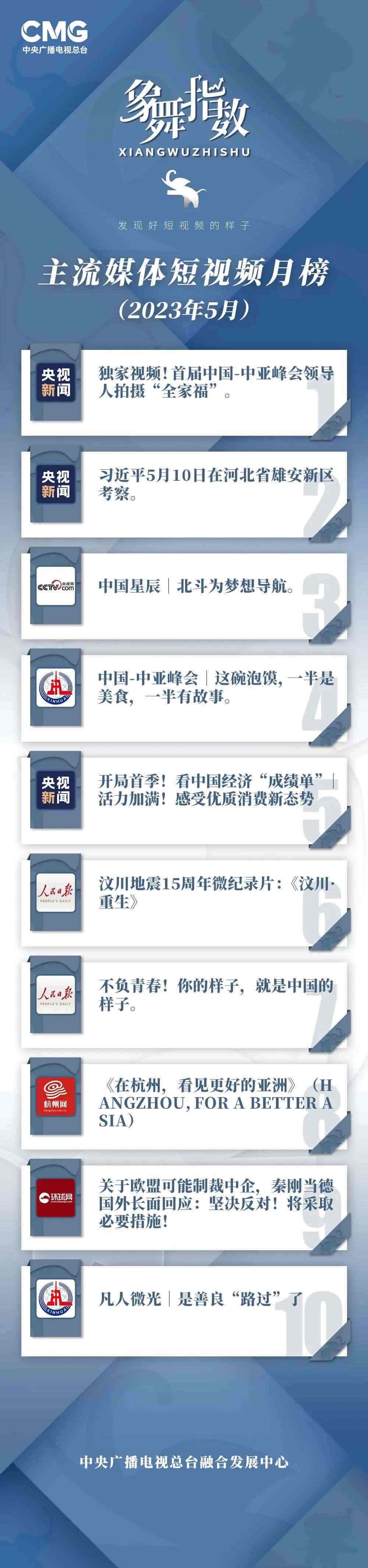 中央廣播電視總臺“象舞指數(shù)”評議品牌,推出主流媒體短視頻月榜、總臺短視頻月榜。在2023年5月,這些內(nèi)容引發(fā)大眾關(guān)注: