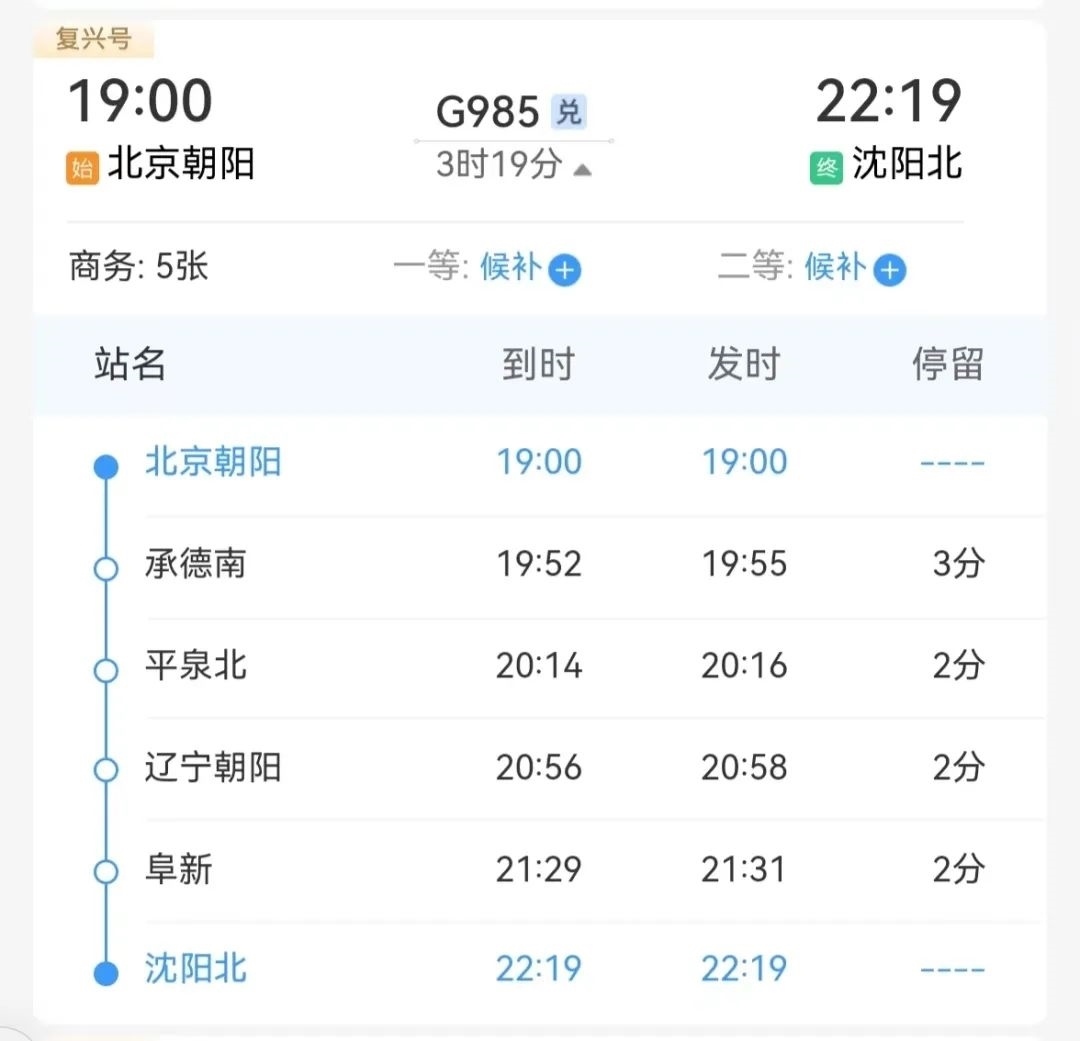 從北京朝陽站開往沈陽北站的