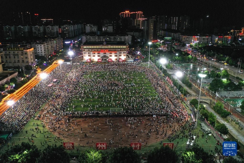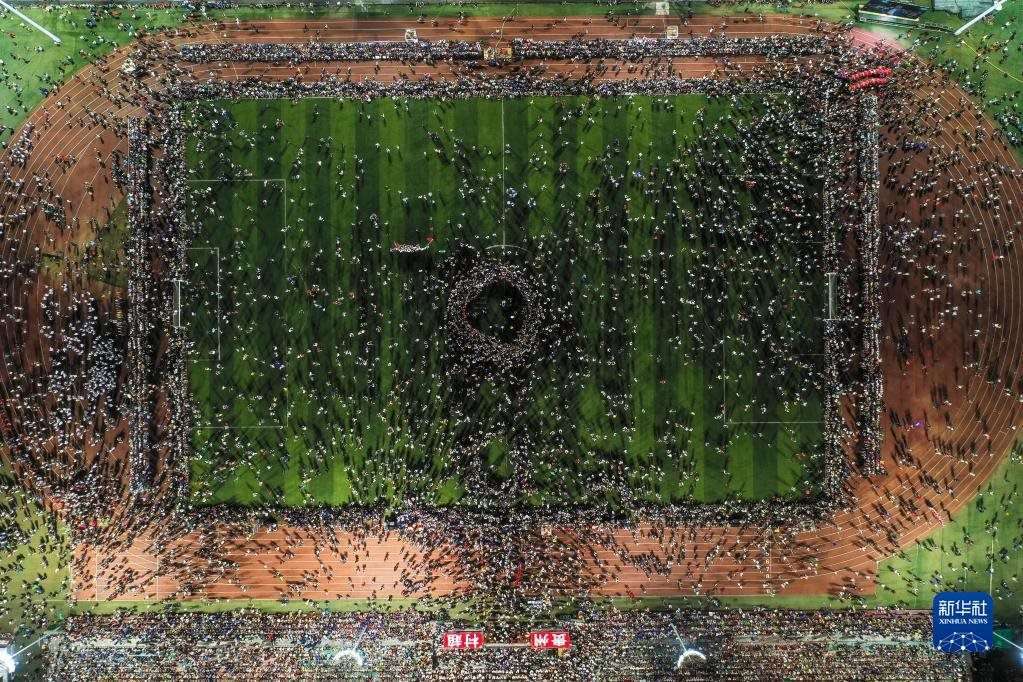 6月10日,演員在貴州“村超”足球比賽后表演民族舞蹈“多耶”,現(xiàn)場觀眾一起上場狂歡(無人機(jī)照片)。