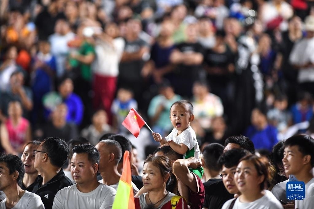 6月9日,一名小朋友與家人觀看貴州“村超”足球比賽。