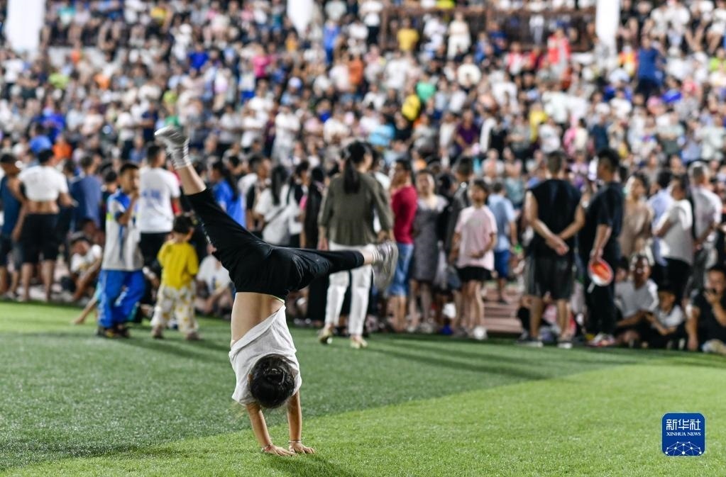 6月9日,小朋友在貴州“村超”足球比賽半場休息時間展示體操。