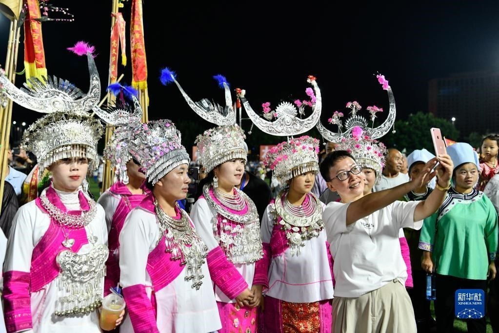 6月9日,一名游客在貴州“村超”足球比賽現(xiàn)場與少數(shù)民族拉拉隊(duì)合影。