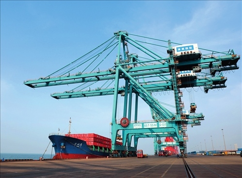 船舶停靠在河北黃驊港綜合港區(qū)集裝箱碼頭進行卸船作業(yè)(2023 年 3 月 9 日攝)駱學(xué)峰攝 / 本刊