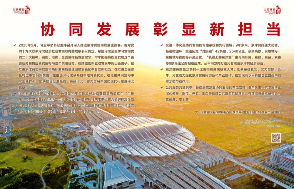 ◇2023年5月,習(xí)近平總書記主持召開深入推進京津冀協(xié)同發(fā)展座談會。他對黨的十九大以來河北經(jīng)濟社會發(fā)展取得的成績表示肯定,希望河北全面學(xué)習(xí)貫徹黨的二十大精神,完整、準確、全面貫徹新發(fā)展理念,牢牢把握高質(zhì)量發(fā)展這個首要任務(wù)和構(gòu)建新發(fā)展格局這個戰(zhàn)略任務(wù),在推進創(chuàng)新驅(qū)動發(fā)展中闖出新路子,在推進京津冀協(xié)同發(fā)展和高標準高質(zhì)量建設(shè)雄安新區(qū)中彰顯新?lián)敚谕七M全面綠色轉(zhuǎn)型中實現(xiàn)新突破,在推進深化改革開放中培育新優(yōu)勢,在推進共同富裕中展現(xiàn)新作為,加快建設(shè)經(jīng)濟強省、美麗河北,奮力譜寫中國式現(xiàn)代化建設(shè)河北篇章。