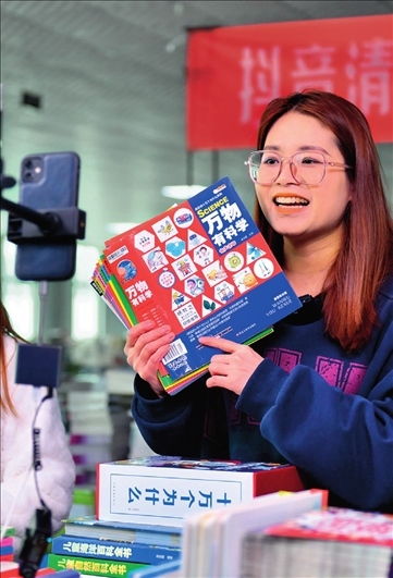 廊坊市永清經(jīng)濟開發(fā)區(qū)京聯(lián)集團館配圖書聯(lián)合現(xiàn)采基地,工作人員在電商平臺直播銷售圖書(2023 年 3 月 26 日攝) 駱學(xué)峰攝 / 本刊