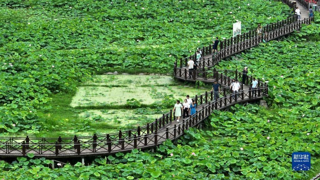 6月13日,游客在柳州市柳江區(qū)百朋鎮(zhèn)萬(wàn)畝荷塘里游玩。