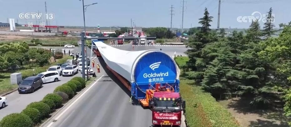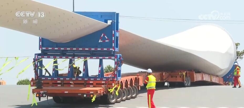 央視網(wǎng)消息:今天(6月14日)上午,100%我國自主知識產(chǎn)權(quán)的123米超長海上風電葉片在江蘇連云港啟動陸地轉(zhuǎn)運工作。上午9時,代表著我國風電裝備最新技術(shù)水準的大葉片,從廠區(qū)到港口碼頭,陸地運輸全程約30公里,耗時約3到4個小時,其中運輸大葉片的車輛還要拐過90度的直角彎。如此大體量的裝備運輸是一個復雜的過程,其中有哪些技術(shù)難點?來看記者今天上午從現(xiàn)場發(fā)回的報道。