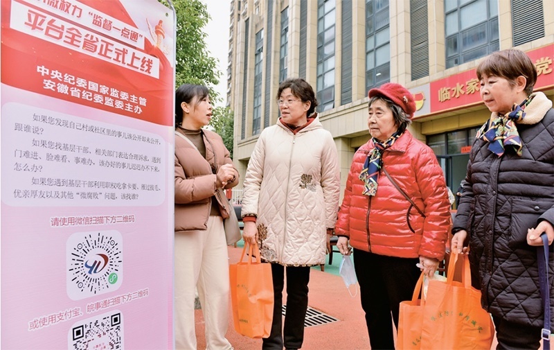 2023年2月17日,安徽省合肥市蜀山區(qū)井崗鎮(zhèn)紀委和衛(wèi)樓社區(qū)工作人員在引導(dǎo)居民關(guān)注了解小微權(quán)力“監(jiān)督一點通”平臺相關(guān)知識。 中新社發(fā) 葛宜年/攝