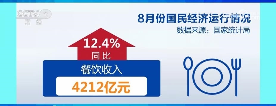 市場銷售加快恢復(fù),8月份,社會消費品零售總額37933億元,同比增長4.6%,增速比上月加快;餐飲收入4212億元,同比增長12.4%,保持較快增速。