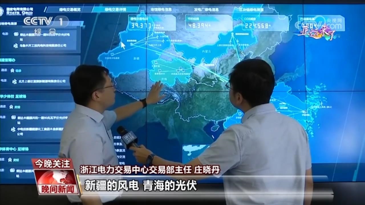 浙江電力交易中心交易部主任 莊曉丹:新疆的風(fēng)電、青海的光伏以及內(nèi)蒙古的風(fēng)電,分別通過(guò)三條特高壓直流線(xiàn)路,向浙江提供綠色電力供應(yīng)。