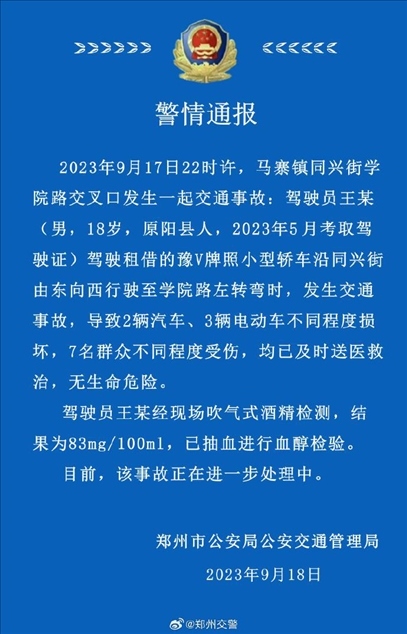 ·鄭州警方通報18歲男子醉駕致7人傷,肇事者剛領駕照4個月。
