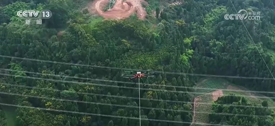 在施工現(xiàn)場,工作人員操作無人機(jī),帶著牽引繩緩緩升空,在140米的高空,帶動重量達(dá)到6噸的導(dǎo)線,緩緩跨過500千伏嘉林線上空,最終架設(shè)在兩基170多米高、間距400米的鐵塔間。