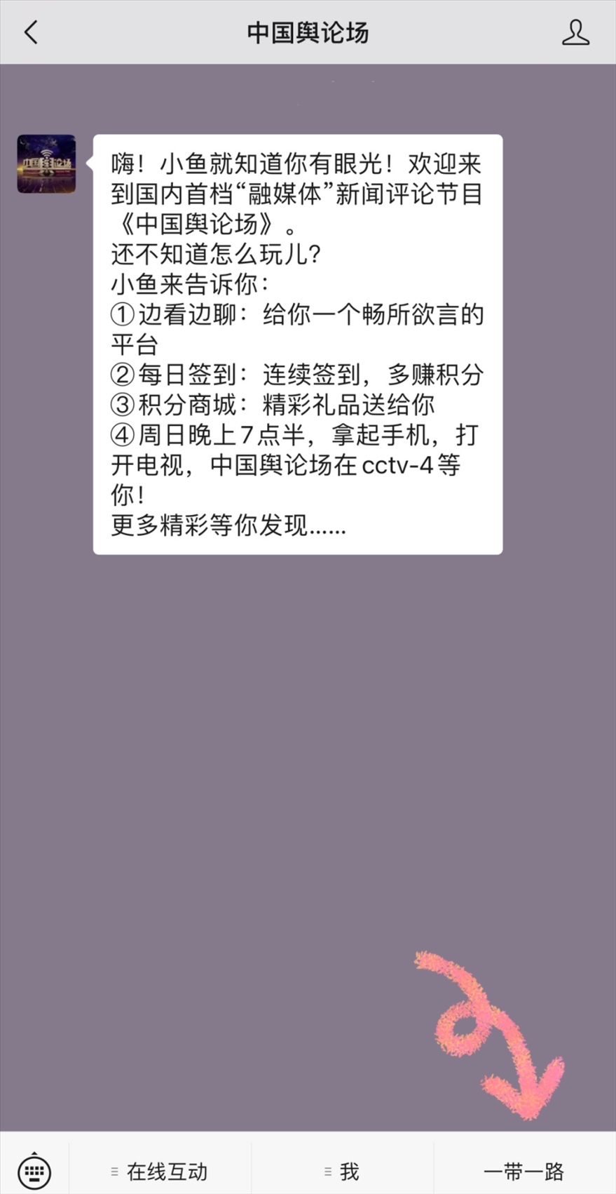 掃描下方二維碼,關(guān)注《中國輿論場(chǎng)》微信公眾號(hào),給我們留言;點(diǎn)擊【一帶一路】,進(jìn)入征集令頁面發(fā)送留言;點(diǎn)擊下方閱讀原文留言;如果您有圖片或視頻展示也可以直接發(fā)送到我們的郵箱(cctv4zgylc@163.com)參與征集活動(dòng)。被選中的留言、圖片和視頻將有機(jī)會(huì)在《中國輿論場(chǎng)》全媒體平臺(tái)上展示。