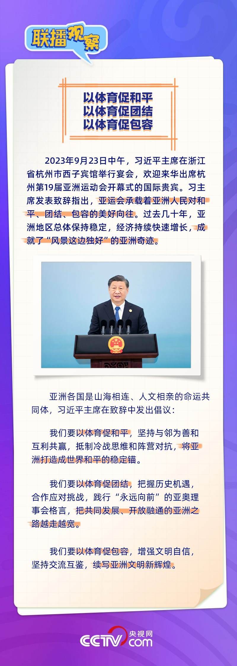 9月23日,習(xí)近平主席在歡迎來華出席杭州第19屆亞洲運(yùn)動(dòng)會開幕式的國際貴賓午宴上祝愿大家“在詩畫浙江度過難忘的時(shí)光,在亞運(yùn)會圣火下留下美好的記憶”。