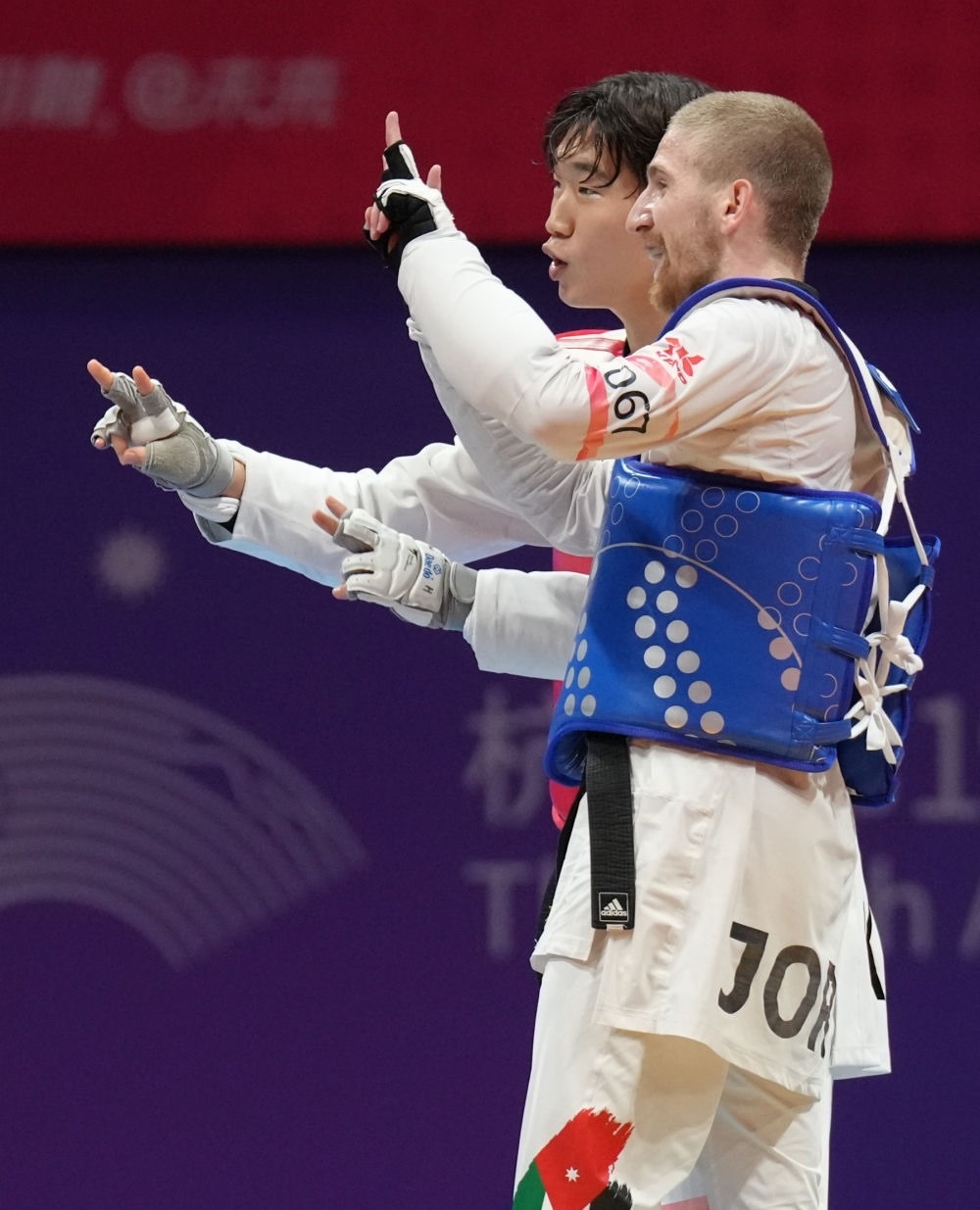 9月27日,韓國選手樸優(yōu)赫(右)在跆拳道男子80公斤級比賽后與約旦選手薩利赫·沙拉巴蒂一起向觀眾致意。