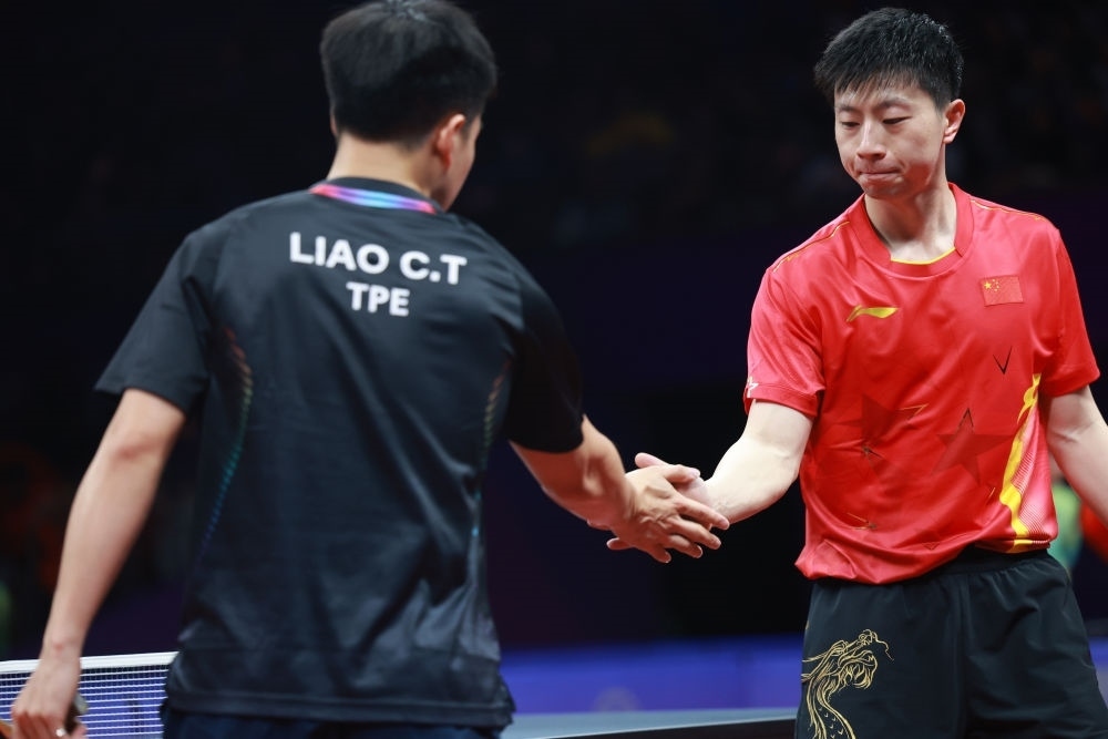 9月25日,中國隊選手馬龍(右)在乒乓球男子團(tuán)體半決賽后與中國臺北隊選手廖振珽握手致意。