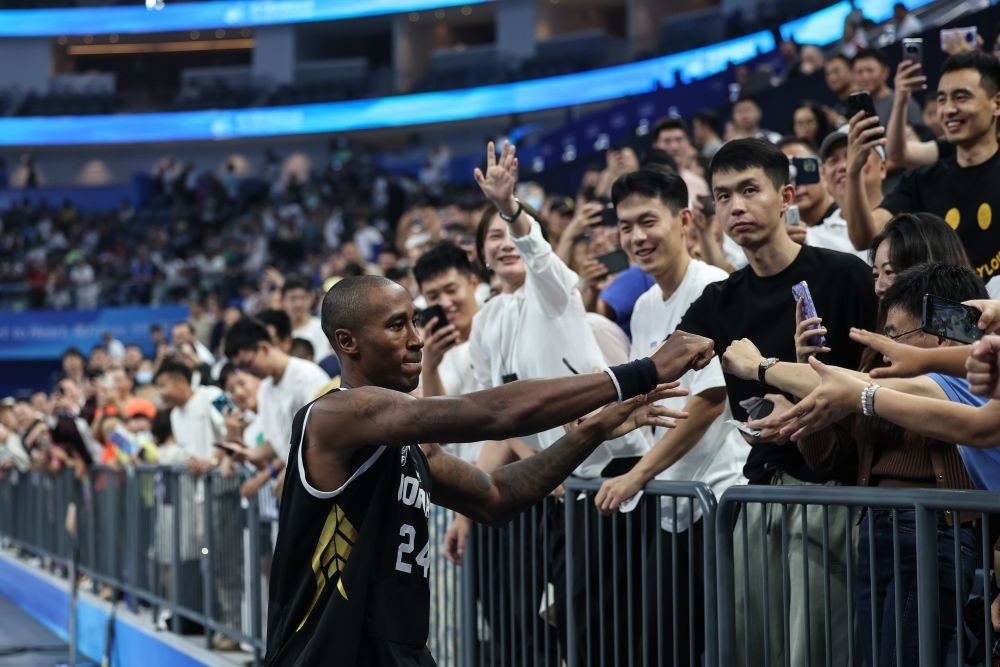 9月28日,約旦隊球員倫達(dá)·杰斐遜籃球男子預(yù)賽C組后與觀眾互動。