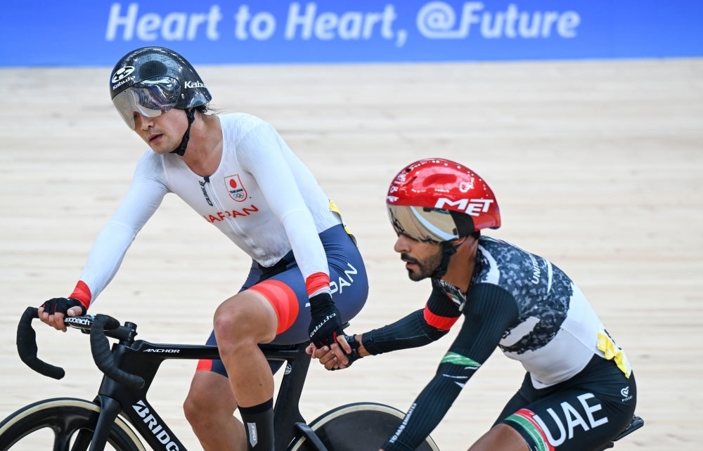 9月28日,日本選手窪木一茂(左)和阿聯(lián)酋選手艾哈邁德·曼蘇里在場地自行車男子全能賽沖刺賽后握手致意。