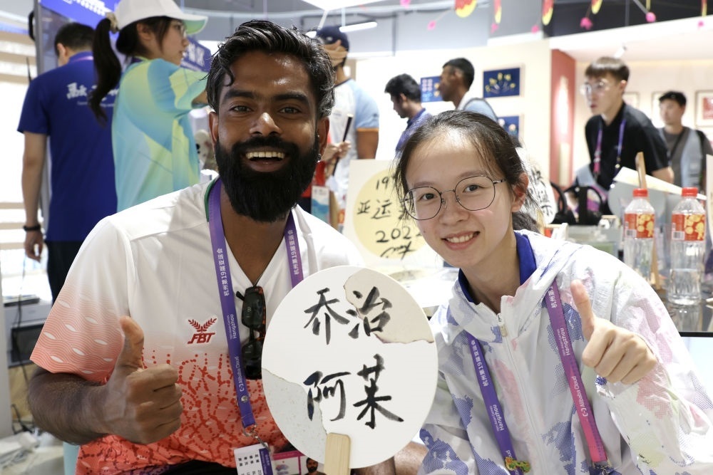 9月29日,馬爾代夫羽毛球運動員穆罕默德·阿杰凡·拉希德(左)在亞運村樂活集市與工作人員合影留念。