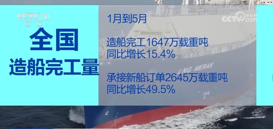 今年1—5月,全國造船完工1647萬載重噸,同比增長15.4%;承接新船訂單2645萬載重噸,同比增長49.5%。5月底,手持船舶訂單11799萬載重噸,同比增長15.5%。綠色船舶理念正逐步貫穿船舶的設(shè)計(jì)建造全過程,成為中國造船業(yè)一張響亮的“名片”。