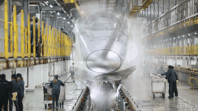 動車組經(jīng)過洗車機(jī)時,調(diào)度室內(nèi)調(diào)度員精準(zhǔn)聯(lián)控司機(jī),機(jī)房有專業(yè)的設(shè)備操作人員負(fù)責(zé)監(jiān)控,確保洗車機(jī)正常運轉(zhuǎn),外皮清洗到位。在動車檢修庫內(nèi),質(zhì)檢員全方位卡控人工清洗環(huán)節(jié),檢查清潔是否到位。