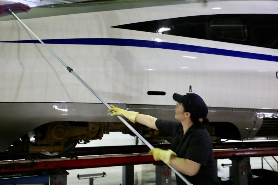 經(jīng)過自動清洗的動車組在開進(jìn)動車所檢修庫后,將由洗車人員進(jìn)行深度清潔。20多名洗車人員分工協(xié)作對動車組車頂、車身等各部位進(jìn)行清洗。