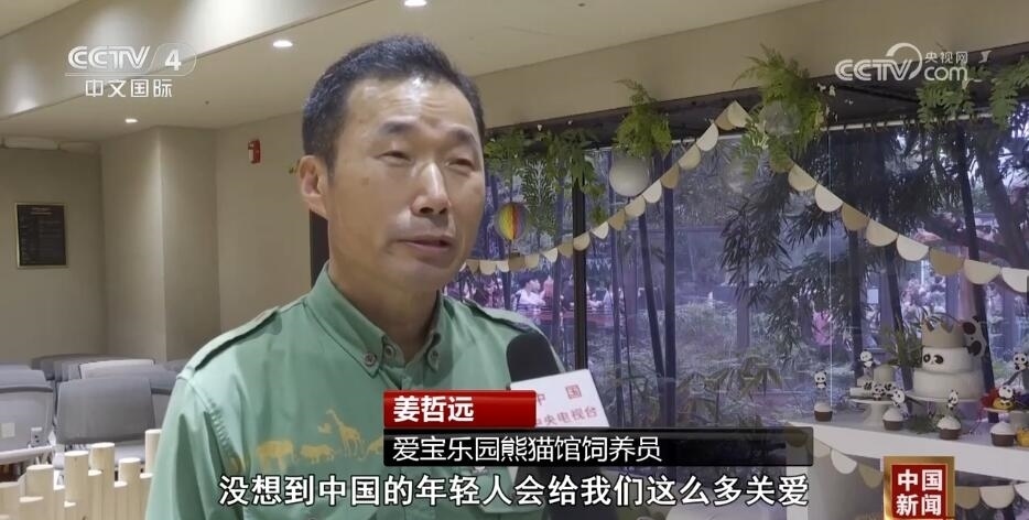 愛寶樂園熊貓館飼養(yǎng)員 姜哲遠(yuǎn):沒想到中國的年輕人會給我們這么多關(guān)愛,非常感謝也非常珍惜大家給我們的關(guān)注。我能做的事情其實(shí)就是像現(xiàn)在這樣,讓福寶繼續(xù)茁壯成長。