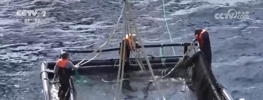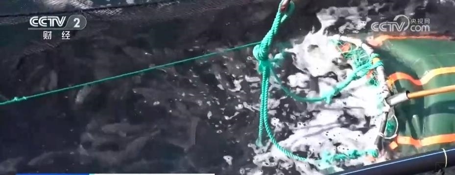 在煙臺(tái)長(zhǎng)島南隍城海域,隨著經(jīng)海系列深水網(wǎng)箱里魚(yú)類(lèi)的成熟,一場(chǎng)在大海上的收獲正在進(jìn)行。起降機(jī)將一個(gè)個(gè)裝滿(mǎn)魚(yú)兒的巨大網(wǎng)兜轉(zhuǎn)移到運(yùn)輸船上,2.5萬(wàn)尾近4萬(wàn)斤的成品黑鲪魚(yú),將從這里銷(xiāo)往全國(guó)各地。