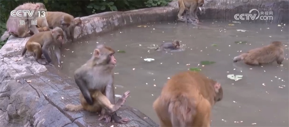 管理員介紹,假如獼猴群棲息地附近沒有水源,保護(hù)區(qū)就會人為設(shè)置水池,從山下通過泵站把水抽上來,供獼猴消夏解暑。