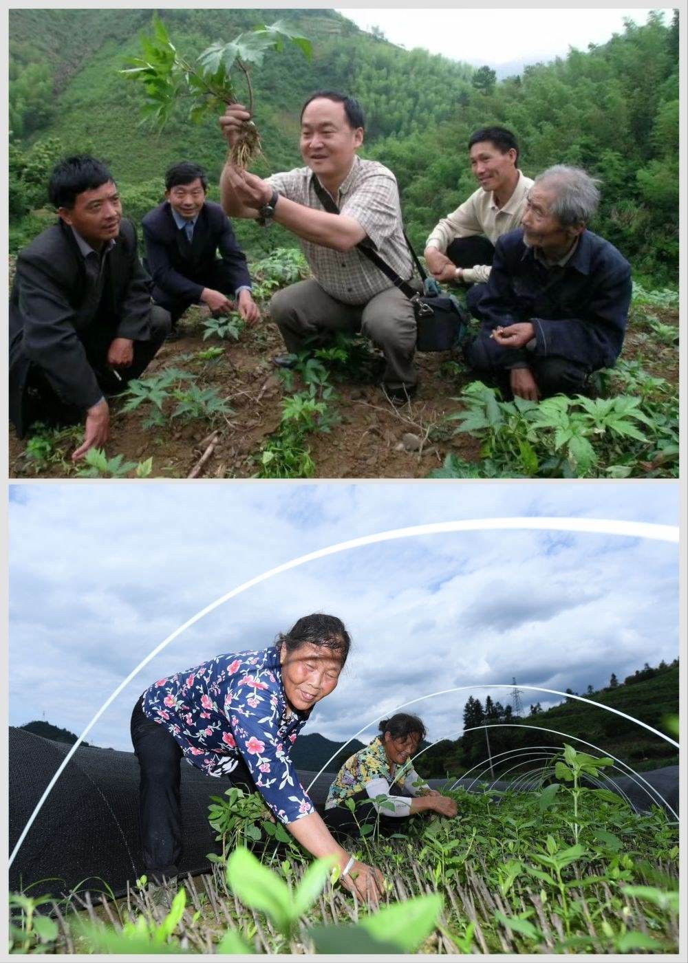 拼版照片:上圖為浙江省中藥研究所有限公司正高級(jí)工程師俞旭平(中)向淳安縣下姜村村民傳授中藥材種植技能(資料照片);下圖為7月3日,村民在淳安縣下姜村一片種植基地查看中藥材扦插苗的生長情況(新華社記者翁忻旸攝)。新華社發(fā)