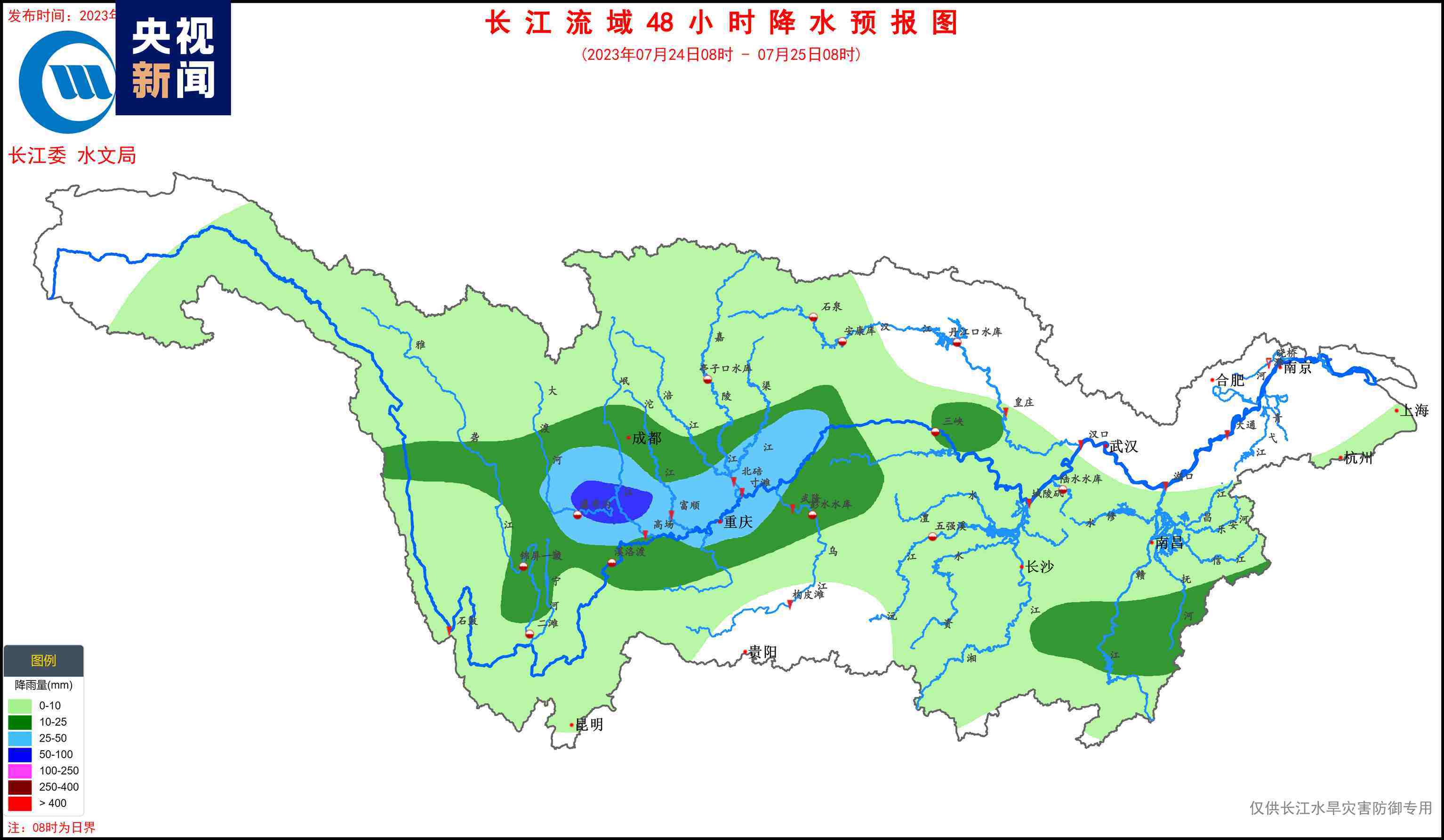 據(jù)水文氣象預報,7月23日,嘉岷流域北部有中雨、局地大雨;24~27日,長江上游干流附近有中到大雨、局地暴雨的降水過程,過程累計面雨量:長江上游干流70毫米,金沙江中下游、雅礱江、岷沱江、渠江、烏江上游30~50毫米??紤]預見期降雨,金沙江中下游、嘉岷流域、赤水河、烏江、三峽區(qū)間將發(fā)生漲水過程,降雨落區(qū)內部分中小河流可能發(fā)生超警洪水,局部強降雨引發(fā)山洪災害的風險高。