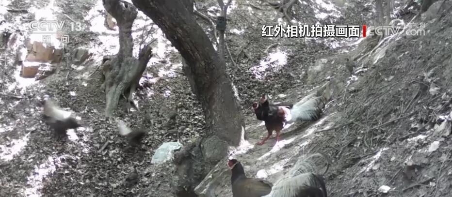 近日,在山西呂梁的孝義市國有林場,紅外相機(jī)記錄到國家一級保護(hù)野生動物褐馬雞最大種群。畫面中,先是兩群褐馬雞在兩棵老樹下覓食玩耍,兩個樹洞內(nèi)積有雨水,它們不斷地前往飲水補(bǔ)給。突然,一只落單的成年褐馬雞入侵,遭到領(lǐng)地一只雄性褐馬雞的追逐驅(qū)趕。不同角度的紅外相機(jī)還捕捉到褐馬雞好奇對視相機(jī)、幼崽上樹打鬧等趣味十足的珍貴影像。