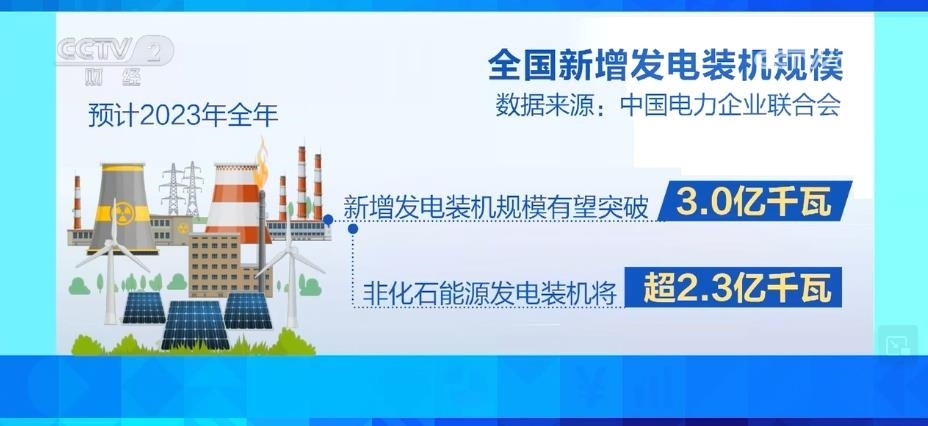 據(jù)預(yù)計,2023年全年,全國新增發(fā)電裝機規(guī)模有望突破3.0億千瓦,其中,非化石能源發(fā)電裝機將超過2.3億千瓦。到2023年底,全國發(fā)電裝機容量預(yù)計將達到28.6億千瓦,同比增長11.5%左右。其中,并網(wǎng)風(fēng)電和太陽能發(fā)電合計裝機容量將達到9.6億千瓦,占總裝機的三分之一。