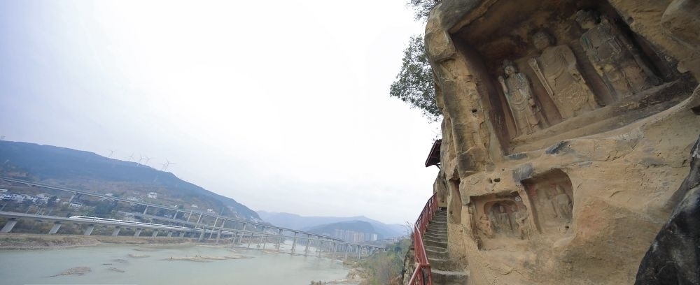 值得關(guān)注的是,就在千佛崖的河對岸,幾條現(xiàn)代化交通網(wǎng)錯(cuò)落有致地交織在一起。今日的廣元是名副其實(shí)的“交通博物館”。老川陜路、京昆高速、寶成鐵路、西成高鐵、嘉陵江航道在這里交織“奔騰”。橫渡嘉陵江,仿佛穿越古今。