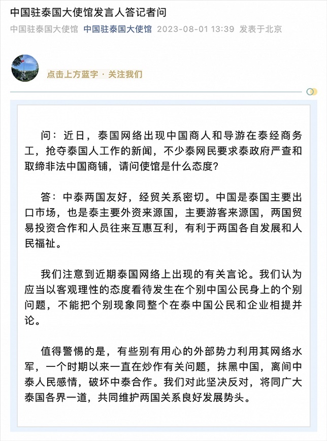 ·中國(guó)商人和導(dǎo)游在泰搶奪泰國(guó)人工作?泰網(wǎng)民要求嚴(yán)查?中使館回應(yīng)。