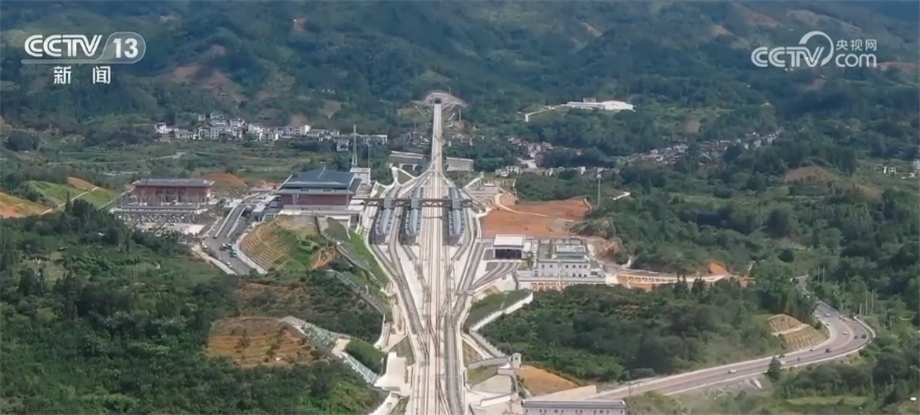 總臺記者 茍順庭:在我身后就是全長12.7公里的貴南高鐵朝陽隧道。因為隧道所在的山體存在有大量的巖溶地質(zhì)點,地下暗河、溶洞溶腔交錯縱橫、環(huán)境復雜,所以這個朝陽隧道是整條線路上風險系數(shù)最高的控制性工程。穿過朝陽隧道后,就到了貴南高鐵貴州段的最后一站——荔波站。