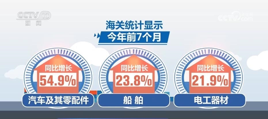 海關(guān)統(tǒng)計(jì)顯示,今年前7個(gè)月,我國(guó)機(jī)電產(chǎn)品出口占比提升,汽車及其零配件、船舶、電工器材同比分別增長(zhǎng)54.9%、23.8%、21.9%。
